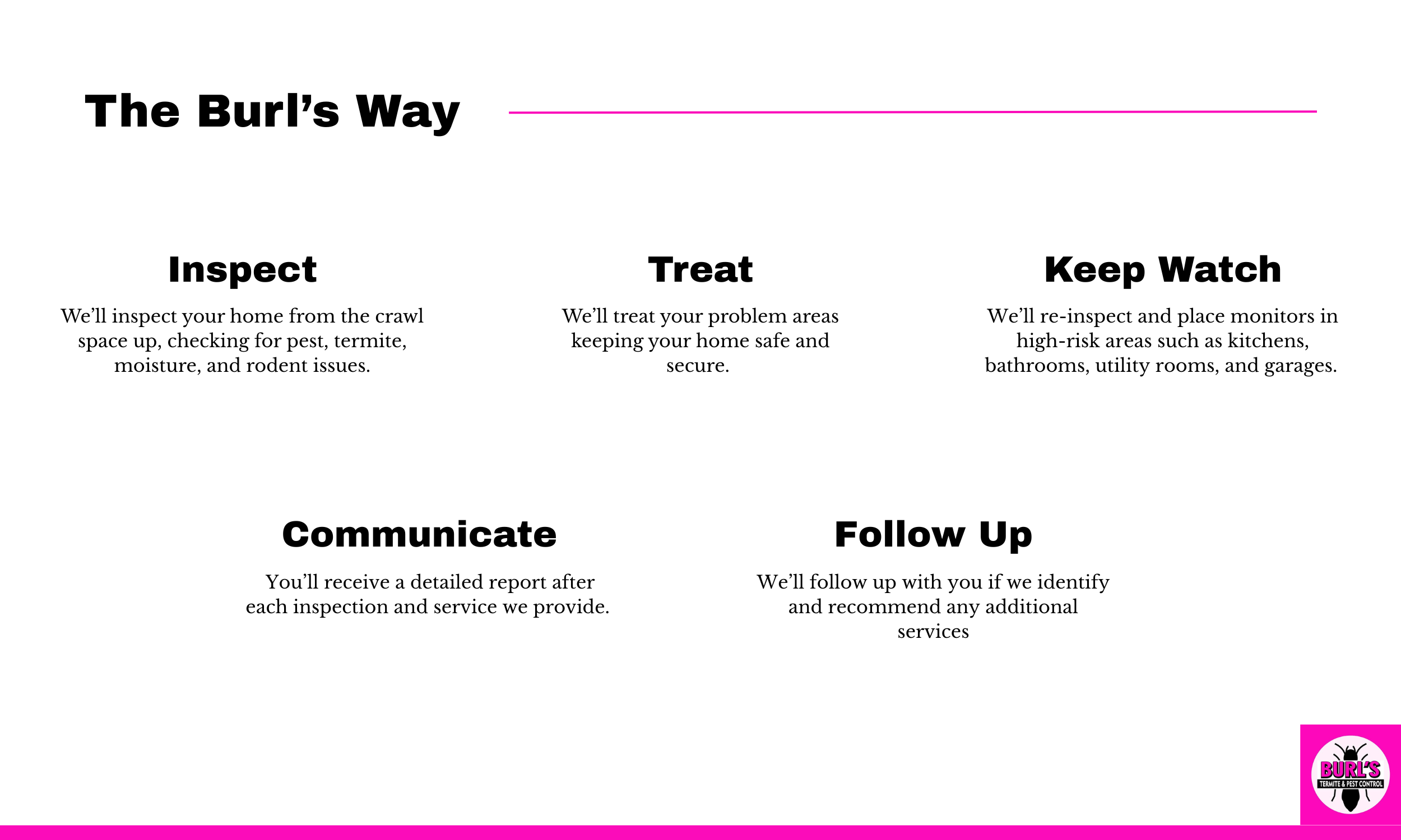 Your business is vulnerable to pest infestations which can cost you customers, referrals and inventory. Pests can spread from foul water and harborage areas to where you conduct business with customers. When it comes to protecting your very important business, nobody does it better than BURL’S Termite and Pest Control.